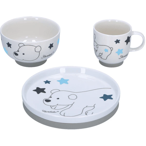 - Porseleinen servies bestaande uit beker, kom en bord met prachtig motief ijsbeer Elia.