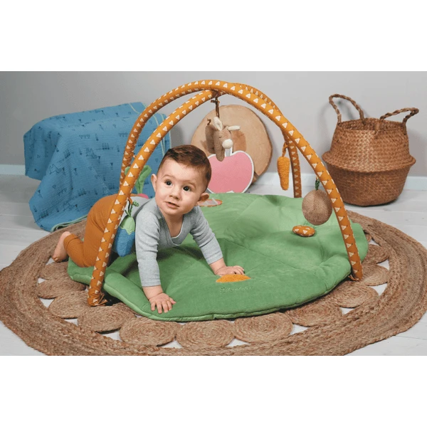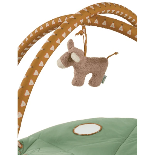 De ronde speelboog met het motief Emmilius de ezel is gemaakt van poly cotton en nickicord. De rammelaar en de spiegelfolie stimuleren de zintuigen van je kleine schat. De figuren zijn ook verwijderbaar.