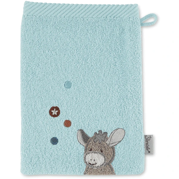 De badstofwashandschoen met geappliqueerd borduurmotief Donkey Emmi staat garant voor plezier bij het wassen.